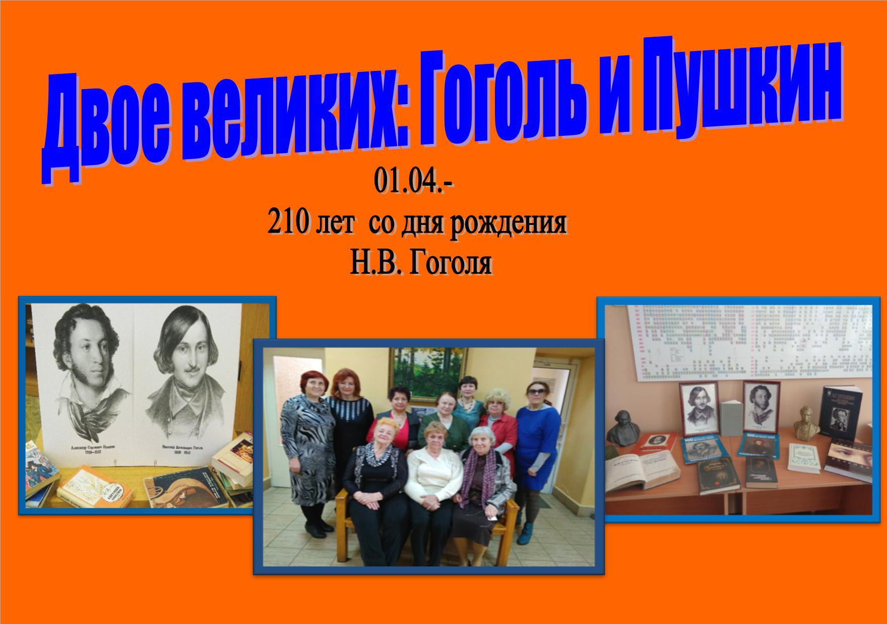 В ГБ имени А. С. Пушкина состоялось очередное заседание «Пушкинъ-клуба». Час открытий «Два великих: Гоголь и Пушкин» был посвящен 210-летию со дня рождения Николая Васильевича Гоголя и его взаимоотношениям с Александром Пушкиным. Собравшиеся узнали много интересных биографических фактов из жизни двух известных классиков, узнали, как породнились их потомки, просмотрели ряд познавательных видеороликов и познакомились с уникальными изданиями собраний сочинений Н. В. Гоголя 1913 и 1940 годов издания. Мероприятие прошло очень интересно, познавательно и приоткрыло занавес тайны на судьбу русского классика Н. Гоголя.