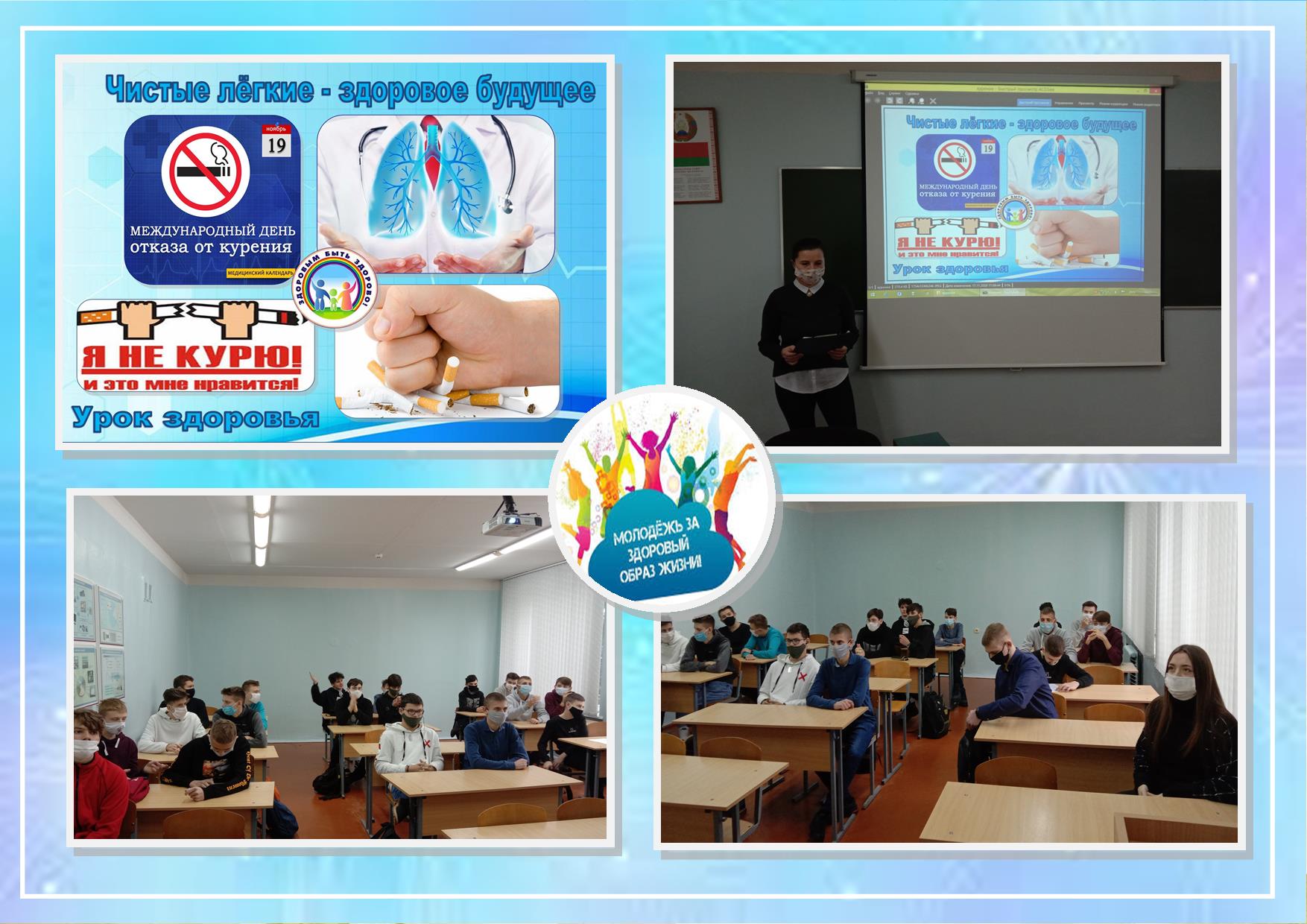 18 ноября для учащихся УО «Бобруйский государственный автотранспортный колледж» сотрудники городской библиотеки №7 имени А.А. Шогенцукова провели урок здоровья по профилактике табакокурения «Чистые лёгкие – здоровое будущее». Библиотекари объясняли учащимся, почему так важно поднимать тему о вреде курения среди молодёжи. Ведь здоровые молодые люди – это стратегический ресурс нашего государства, его будущее. В ходе мероприятия учащиеся узнали исторические факты о распространении табака по странам Европы и России, а также рассмотрели предполагаемые причины курения, как и почему люди берут в руки сигарету. Особое внимание было обращено на разрушительное влияние курения на организм человека и страшные последствия этой пагубной привычки. Мероприятие чередовалось просмотром тематических роликов и социальной рекламой. Завершился урок просмотром видеофильма «Жертвы привычки», созданный МЧС Республики Беларусь об опасности непотушенной сигареты в руках курящего человека.