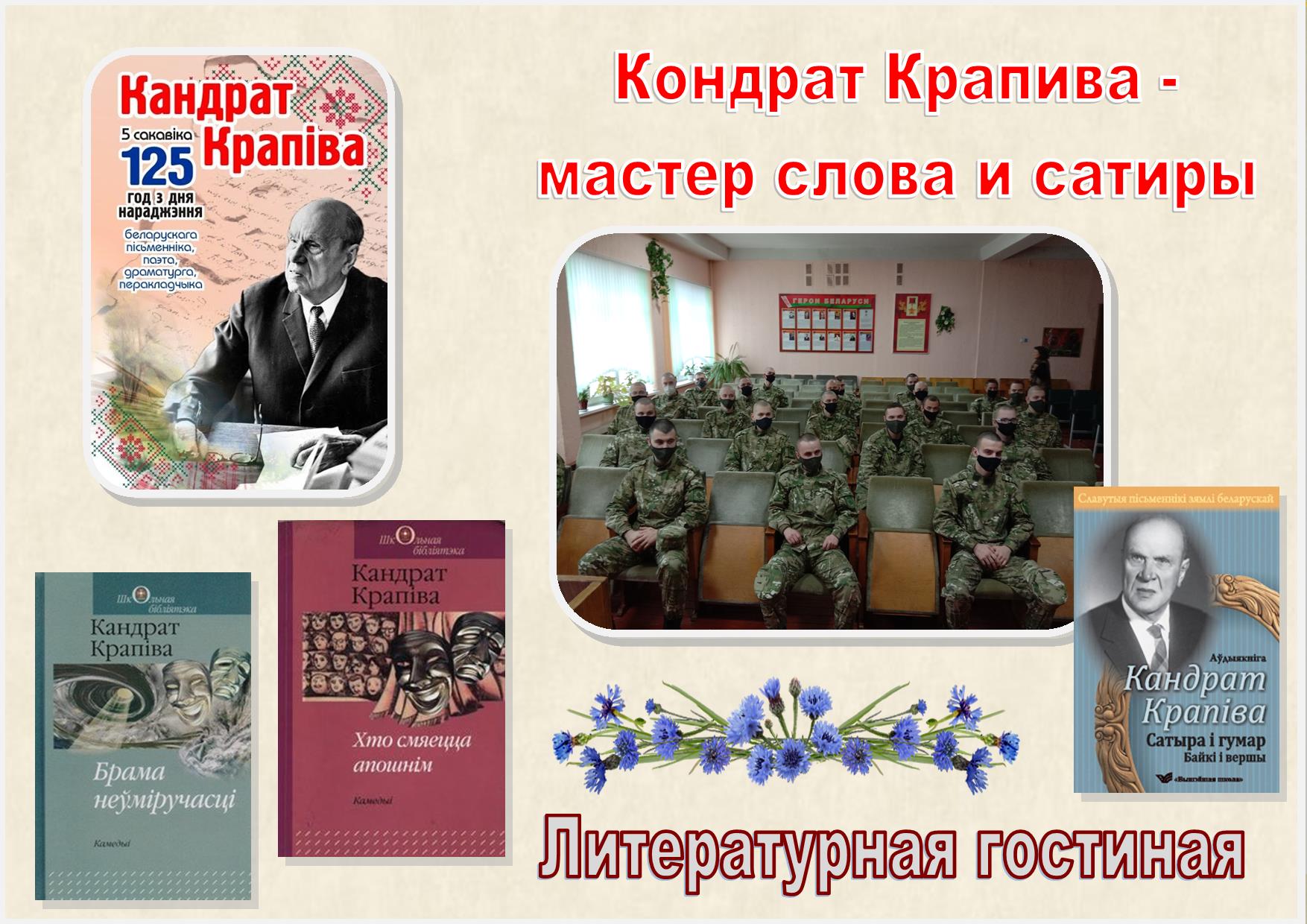 В рамках клуба «У солдата выходной» для военнослужащих Отдельного специального батальона милиции войсковой части №5527, библиотекарь городской библиотеки № 7 им. А.А. Шогенцукова организовала и провела литературную гостиную «Кондрат Крапива – мастер слова и сатиры», посвящённую 125-летию со дня рождения народного писателя Беларуси. Во время мероприятия военнослужащие ознакомились со страницами биографии и творчеством сатирика, библиотекарь читала басни, анализируя прочитанное. Вниманию аудитории был представлен документальный фильм “Кандрат Крапіва: чалавек, які смяяўся”.