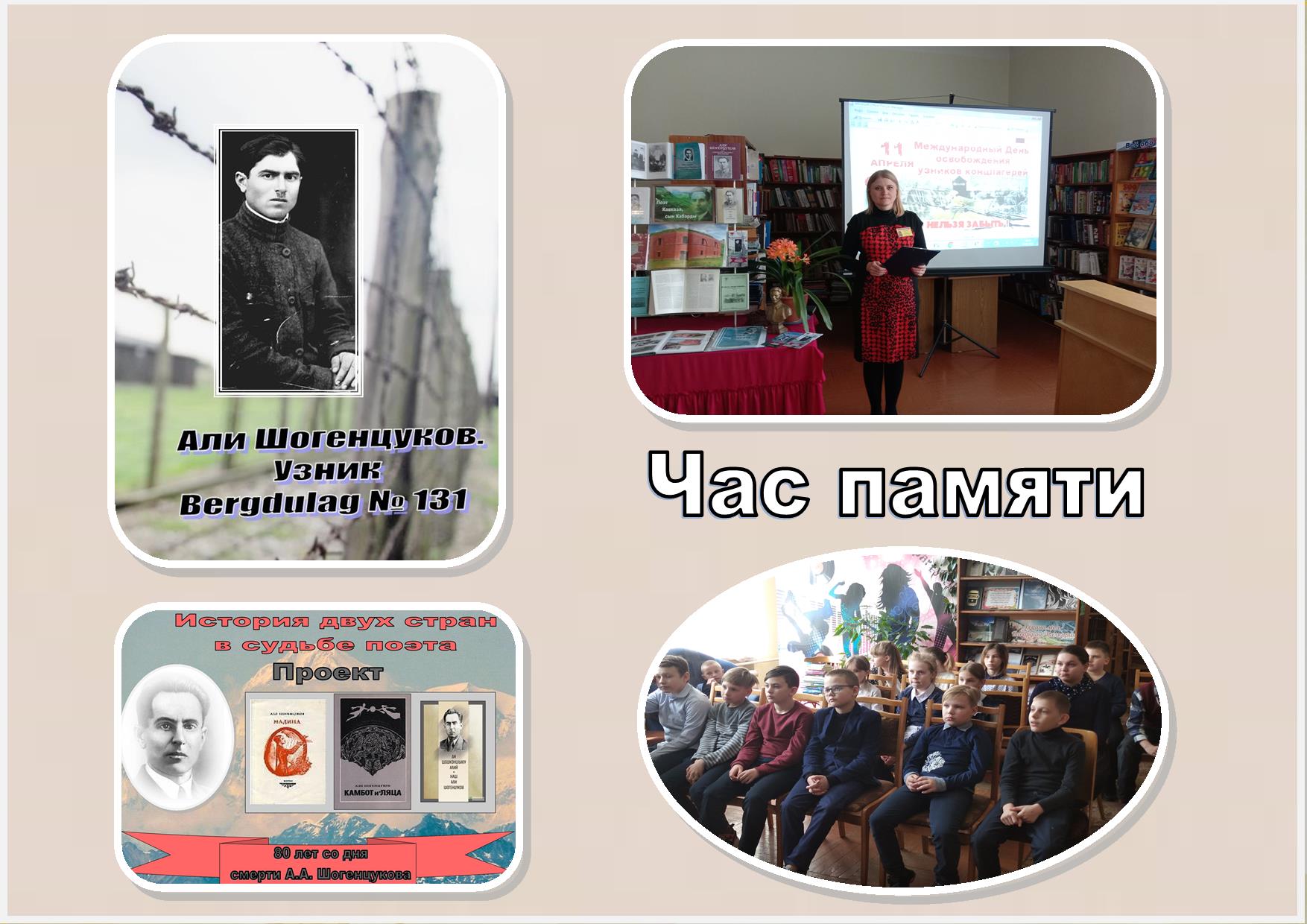Ежегодно 11 апреля отмечается Международный день освобождения узников фашистских концлагерей, который установлен в память об интернациональном восстании узников концлагеря Бухенвальд, произошедшем 11 апреля 1945 года. Этот день не даёт миру забыть о неоправданной жестокости и беспощадности фашизма. История напоминает нынешнему поколению о том, какой огромной ценой досталось нам мирное небо над головой. В рамках проекта «История двух стран в судьбе поэта» 7 апреля сотрудник городской библиотеки №7 им. А.А. Шогенцукова организовала и провела для учащихся 4 «В» класса ГУО «Средняя школа №19 г. Бобруйска» час памяти «Узник Бобруйского лагеря смерти №131», посвящённый памяти А.А. Шогенцукова. В ходе мероприятия ребята познакомились со страницами биографии кабардинского поэта и соприкоснулись с удивительным миром его поэзии. Жестокая война убила Али Шогенцукова на взлёте, когда он был полон творческих планов и надежд. Всего 41 год суждено ему было прожить, но он навсегда остался в памяти народа, отмеченный высшей наградой – Бессмертием.