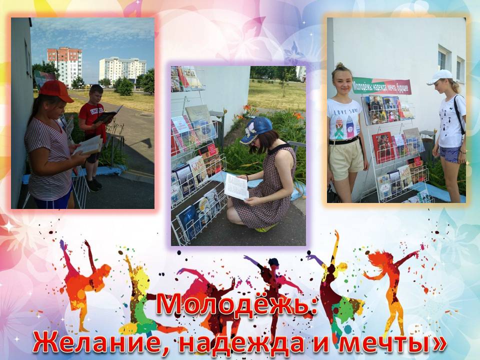 В городской библиотеке № 4 им. Б.М. Микулича прошла акция «Молодёжь: надежда, желание и мечты». Молодежь – является самой активной и мобильной частью общества, быстрее адаптирующейся к изменениям и легче усваивающей новые знания, тем самым она является главным людским ресурсом для развития, положительных социальных перемен и технологических инноваций. Поэтому на площадке около библиотеки была оформлена книжная выставка, где молодые люди могли познакомиться с литературой научного характера, художественной литературой. Отвечали ребята и на вопрос: «Легко ли быть молодым?», ведь нашу молодежь волнует многое: политика, отношение в семье между родителями, отношения со сверстниками и учителями, выбор жизненного пути.