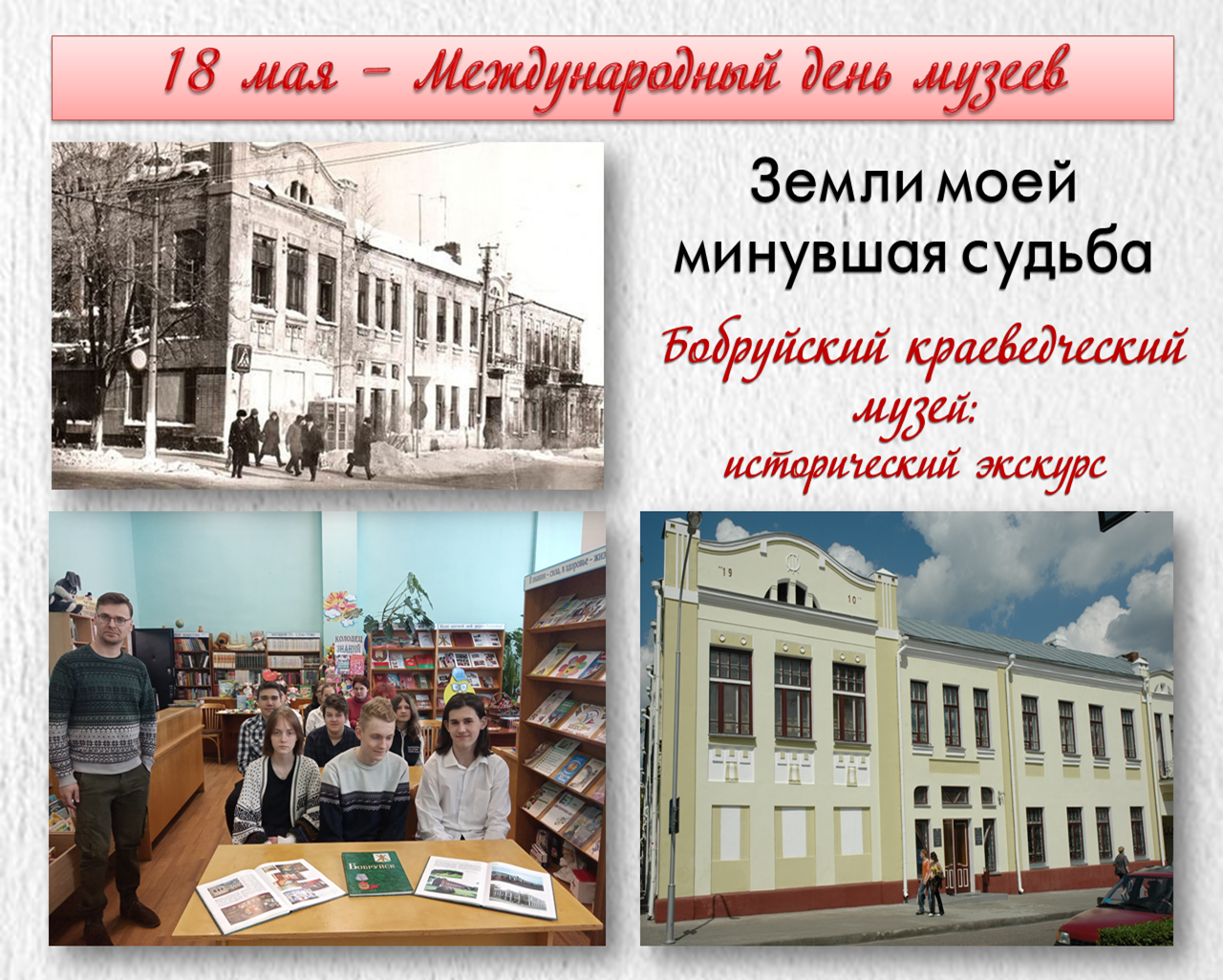 В центральной детской библиотеке им. А.П.Гайдара состоялся исторический экскурс в Бобруйский краеведчесий музей «Земли моей минувшая судьба» для учащихся 9 «А» класса ГУО «Средняя школа № 2 г. Бобруйска». Школьники узнали, что Бобруйский краеведческий музей – один из старейших музеев Беларуси. Его первым директором стал любитель-краевед Ц.Я.Славин. В годы оккупации города немецко-фашистскими захватчиками здание музея, расположенного тогда по улице Пушкина, 145, было разрушено, экспонаты разграблены. Большинство материалов, хранившихся в довоенном музее, оказались утраченными для бобруйчан навсегда. С 1996 года музей размещается в историческом центре города в двухэтажном здании, которое признано памятником архитектуры стиля «модерн».