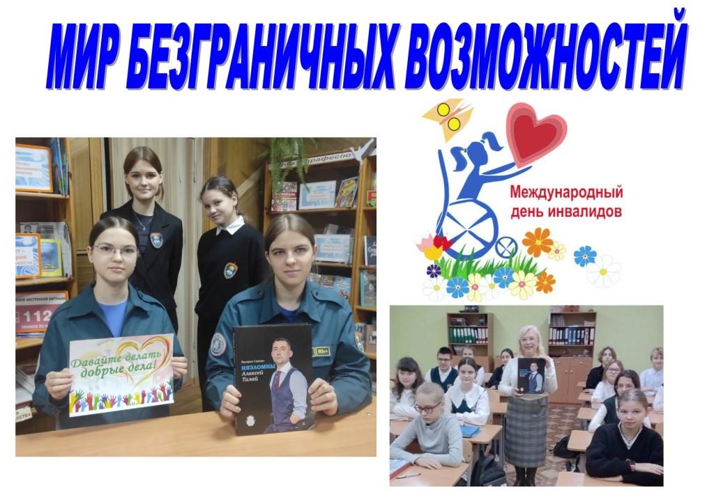 К этой дате городская библиотека № 16 провела с учащимися 7-х и 10-х классов ГУО «Средняя школа № 28 г. Бобруйска» тематический час «Мир безграничных возможностей». Мероприятие было посвящено судьбам людей с ограниченными физическими возможностями. К инвалидности их привели разные обстоятельства, но их жизнь – пример стойкости и мужества, упорства в достижении поставленной цели.