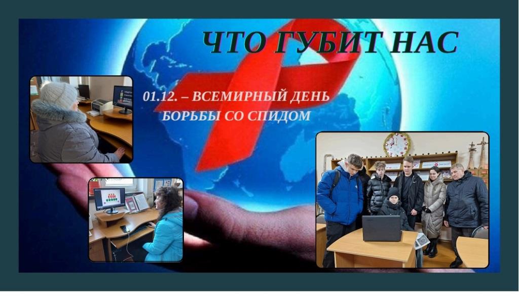 Ежегодно 1 декабря отмечается Всемирный день борьбы со СПИДом. В этот день для пользователей библиотеки прошел информационный видео час «Что губит нас». Библиотекари познакомили с историей Всемирного Дня борьбы со СПИДом, с целью привлечения внимания мировой общественности к проблеме СПИДа, ценности человеческой жизни. К мероприятию была оформлена выставка-предупреждение «Наша жизнь не дается нам дважды» о проблемах СПИДа, а также показан документальный видеофильм «СПИД. Борьба за жизнь», после просмотра которого желающие активно принимали участие в видео викторине «СПИД – это реальность XXI века». Единственное средство остановить распространение вируса по планете – не дать ему проникнуть в организм. Только от нас самих зависит, останемся мы здоровыми, или будем жить с ВИЧ. Как уберечь себя, должны знать все, в том числе и дети.