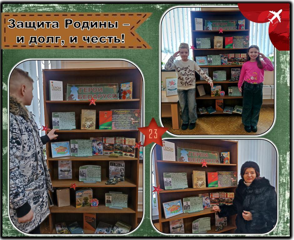 Беларусь помнит и чтит подвиг павших и живых, известных и безымянных белорусов – солдат Великой Отечественной войны. Беларусь помнит миллионы граждан, угнанных в фашистское рабство, замученных в концлагерях и гетто, помнит тех, кто ковал Победу в тылу врага у станков и освобождал страну от немецко-фашистских захватчиков. В рамках цикла библиотечных мероприятий «О Родине. О мужестве. О славе» ко Дню защитников Отечества и Вооруженных Сил Республики Беларусь в городской библиотеке им. А.С. Пушкина состоялась эрудит-акция «Защита Родины – и долг, и честь!». Читателям была представлена информационная выставка «Герои Беларуси» о 10 удивительных подвигах белорусов в годы ВОВ, таких как С.И. Грицевец, И.И. Якубовский, П.Я. Головачёв, Н.В. Ромашко и др. Посетителей ждали интерактивные игры, ребусы, составление анаграмм и познавательные вопросы викторины «Солдатушки, браво ребятушки». Также читатели смогли прослушать музыкальную страничку «Любимые мелодии многих поколений».