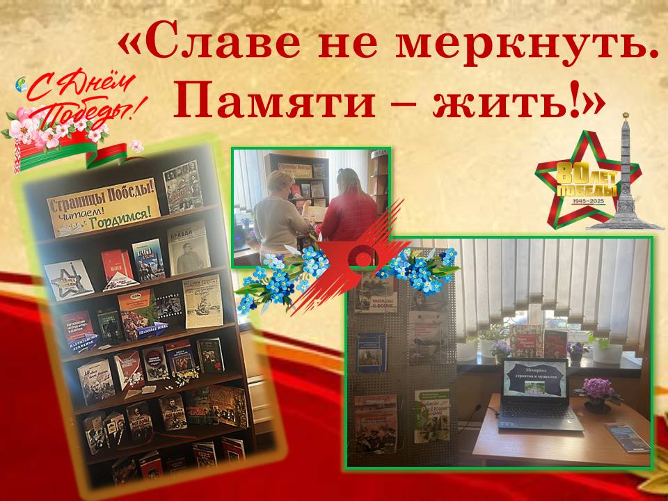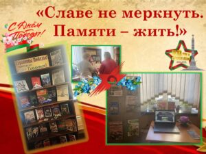 Ко Дню Великой Победы была оформлена выставка «Страницы Победы. Читаем! Гордимся!». Вниманию читателей были представлены художественные и публицистические книги о героях войны и тружениках тыла, о детях-героях, документальные свидетельства участников военных событий и воспоминания фронтовиков, книги о подвигах народа, вписавших золотые страницы в историю Великой Отечественной войны. Выставка дала возможность каждому лично соприкоснуться с великим подвигом народа. Для посетителей библиотеки была подготовлена электронная презентация «Мемориал героизма и мужества», посвящённая созданию мемориального комплекса «Курган славы» в д.Сычково. Дети Беларуси должны знать, помнить и чтить то, что было создано предыдущим поколением, пройдя через боль, лишения, потери, горе и слёзы, но при этом сплотившись и не упав духом. Мероприятие направлено на то, чтобы ещё раз напомнить всем о необходимости знать историю своей страны и навсегда в сердце сохранить благодарность людям, завоевавшим мир и покой на земле.