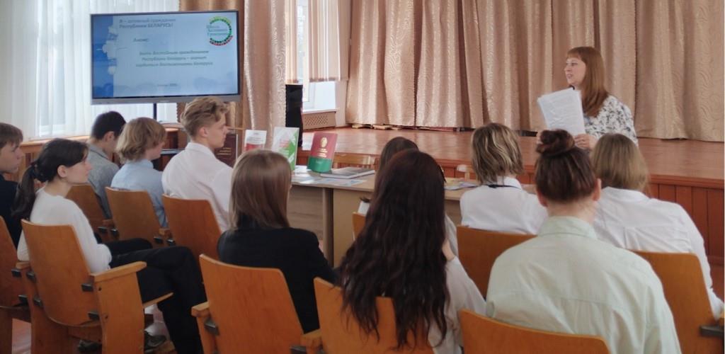 В рамках информационно-образовательного проекта «Школа Активного Гражданина» (ШАГ) городская библиотека №12 провела урок патриотического воспитания «Быть достойным гражданином Республики Беларусь – значит разделять и поддерживать духовные ценности белорусского общества». Во время мероприятия библиотекарь вместе с ребятами разбирали, что такое духовные ценности белорусского народа, включая патриотизм, толерантность, миролюбие. Особое внимание уделили историко-культурному наследию Беларуси. Поговорили о важности сохранения традиционных семейных ценностей, таких как отзывчивость, трудолюбие и поддержка семьи как основы общества. Школьники собирали пазлы и коллажи из  раздаточных материалов, что способствовало живому диалогу и творческому подходу. Атмосфера была дружелюбной и вовлекающей. В завершении мероприятия все  спели  Государственный гимн Республики Беларусь.