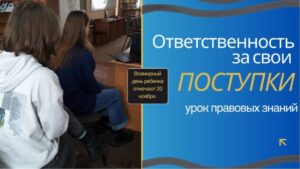 В преддверии Всемирного дня ребенка в городской библиотеке им. А.С.Пушкина прошёл урок правовых знаний «Ответственность за свои поступки». В начале мероприятия библиотекарь напомнила присутствующим о том, что их права записаны в Декларации прав ребенка, которую создала и приняла Организация Объединенных наций в 1956 году, и в Законе Республики Беларусь «О правах ребенка». Пользователи ответили на вопросы викторины «Мои права», приняли участие в игре «Разрешается – запрещается». Мероприятие сопровождалось показом короткометражных роликов. Пользователи в ходе игры усвоили основные права и повторили свои обязанности, пришли к выводу: пользуясь своими правами, не нарушать права других.
