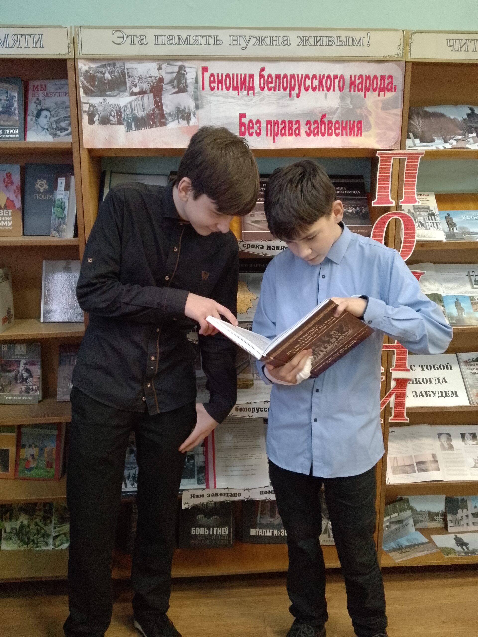 Центральная городская библиотека им. М.Горького и городская библиотека № 16 приняла участие в мероприятии ГУО «Детская школа искусств № 1 имени Е.К.Тикоцкого г. Бобруйска» с выставкой «Геноцид: трагедия и правда памяти». На выставке были представлены книги о геноциде белорусского народа во время Великой Отечественной войны, документальные материалы о последствиях фашизма на территории Беларуси, книги о судьбах людей, переживших ужасы оккупации.