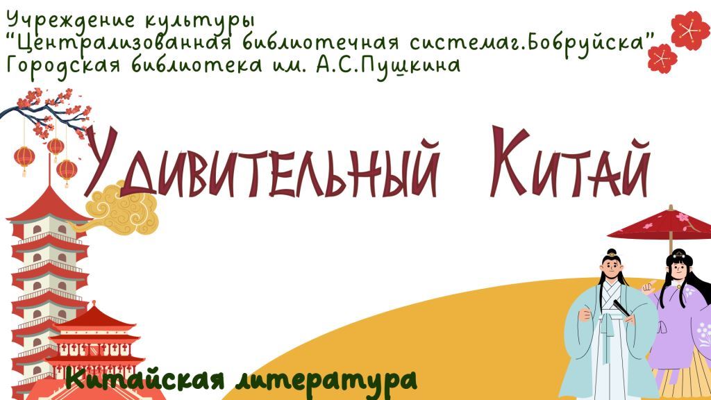 Городской библиотекой им. А.С.Пушкина была подготовлена виртуальная выставка китайской литературы “Удивительный Китай”. Книги, представленные в данной подборке, находятся в библиотеке.